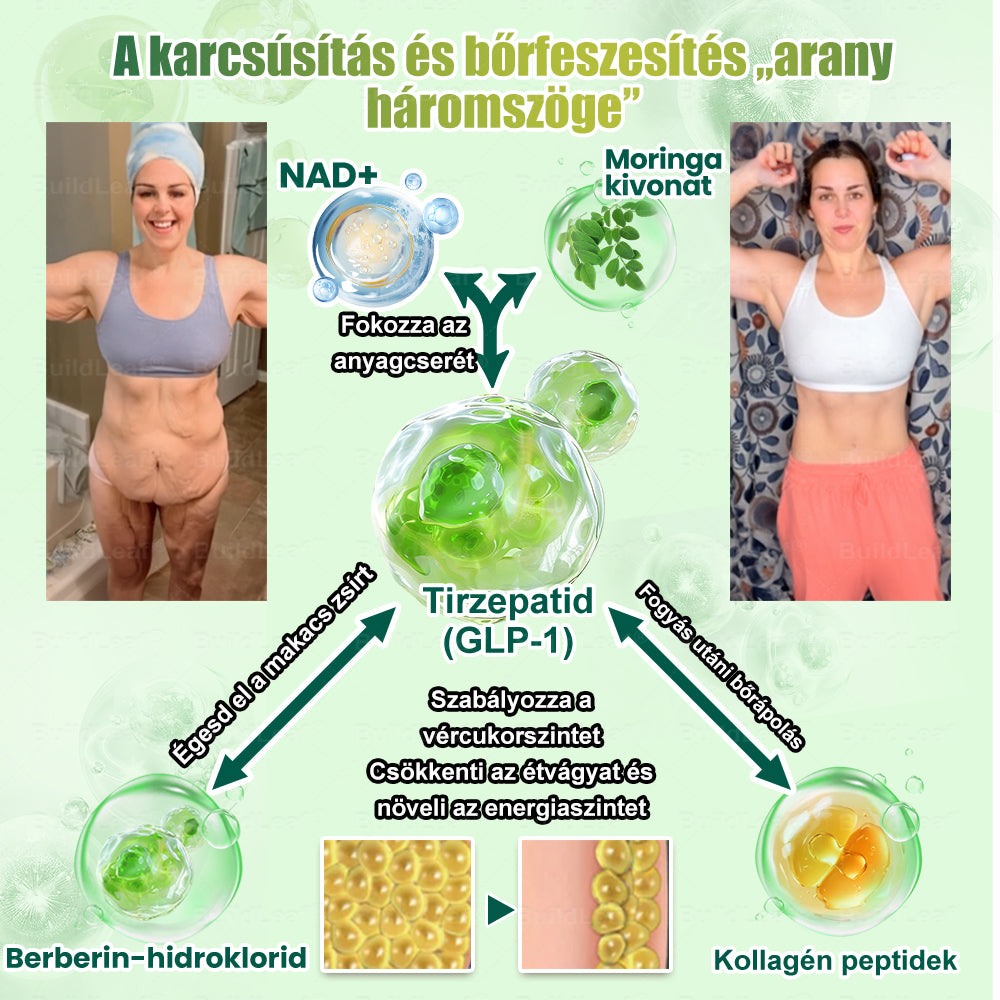 A tirzepatid (GLP-1) csökkenti a tĂșlzott kalĂłriabevitelt, mĂg a berberin-hidroklorid felgyorsĂtja a zsĂranyagcserĂ©t a sejtek energiaĂștjainak aktivĂĄlĂĄsĂĄval. A zöld tea kivonat fokozza a termogenezist Ă©s az energiafelhasznĂĄlĂĄst, az almaecet por megakadĂĄlyozza a zsĂrraktĂĄrozĂĄst, a magnĂ©zium pedig fokozza a mitokondriĂĄlis energiatermelĂ©st. Az omega-3 tĂĄmogatja a zsĂroxidĂĄciĂłt Ă©s javĂtja a szĂv- Ă©s Ă©rrendszer mƱködĂ©sĂ©t, mĂg a szilimarin segĂti a mĂĄj mĂ©regtelenĂtĂ©sĂ©t, biztosĂtva a hatĂ©kony zsĂranyagcserĂ©t. EgyĂŒttesen felgyorsĂtjĂĄk a zsĂrĂ©getĂ©st Ă©s a tĂĄrolt zsĂrt tartĂłs energiĂĄvĂĄ alakĂtjĂĄk â lĂĄthatĂł eredmĂ©nyekkel 3-6 hĂ©ten belĂŒl, beleĂ©rtve az akĂĄr 30%-kal jobb zsĂranyagcserĂ©t Ă©s a csökkent derĂ©kbĆsĂ©get.