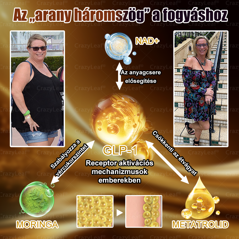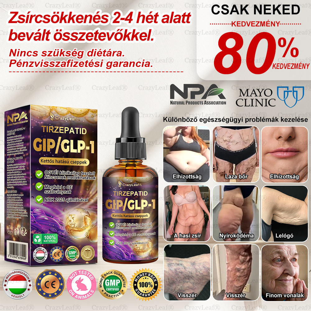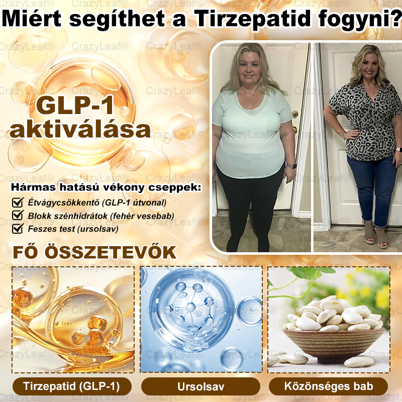 Endokrinológus által klinikailag tesztelve, a CrazyLeaf® Tirzepatide GIP/GLP-1 kettős hatású fogyasztó és egészségjavító cseppek aktiválása már csupán 7 nap alatt jelentősen javíthatja az elhízást és más egészségügyi problémákat.
